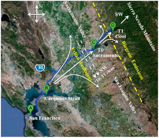 A study of the meteorological parameters characterizing the transport of aerosols during the CARES campaign was published by Fast et al. [25]. In brief, near-surface thermally-driven upslope flows, including synoptic southwesterly (SW) winds, were favorable for transport of the urban plume from Sacramento, CA to the T1 site near Cool, CA. These patterns were occasionally interrupted by a northwesterly (NW) flow, which carried the urban plume southeast to the San Joaquin Valley (Figure 1), thereby reducing the interaction of the urban plume with biogenic emissions at T1 and providing recirculation to T0.