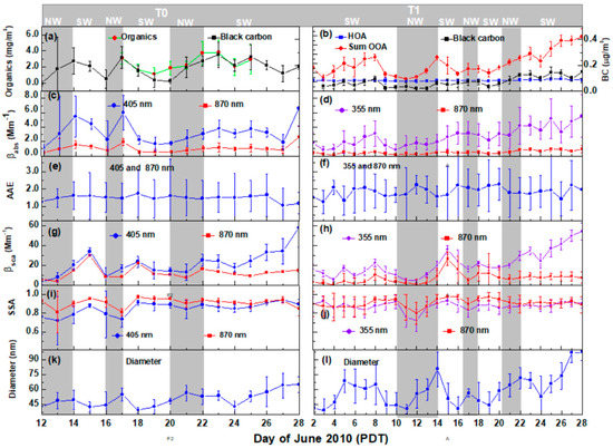 The left panels of Figure 2 show the daily daytime (06:00 to 18:00 PDT) average of PM1 organic mass concentration, the PA measurements of βabs and βsca, AAE, SSA, and the particle mobility diameter (particle mean number-weighted diameter) measured by the SMPS at T0 from 12 to 28 June 2010. Likewise, the right panels of Figure 2 present similar measurements for the T1 site, from 2 to 28 June 2010. The vertical bars in PM1 organic mass concentration, βabs, βsca, and PM1 mean diameter represent one standard deviation of the averaged measurements during daylight hours. The uncertainties of SSA and AAE were determined by the error propagation technique, which is described in Section 2.4. PM1 organic mass concentration measurements at T0 were available only from 17 to 25 June 2010. The gray bar at the top of Figure 2 indicates periods during which the synoptic wind was either southwesterly (SW) or northwesterly (NW). Semi-transparent gray shading for the NW flow periods is also shown over all the plots.