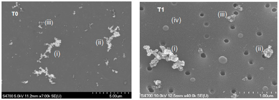 Figure 3 (left image) shows a field emission scanning electron microscope (FE-SEM) image of particles collected at the T0 site on a nuclepore membrane. The image shows a broad size distribution of BC aggregates as large as 4.5 µm in the longest dimension (Figure 3i). Freshly emitted BC particles can be mixed with partly coated BC particles (Figure 3ii), or coated by other material (Figure 3iii) (darker region), such as unburned fuel, lubricating oil, or organic matter [47,51].