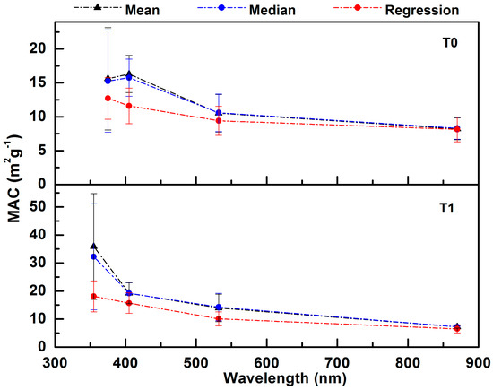 Error bars for MAC were calculated from the propagation of the standard error of the slope, instrument precision, and calibration uncertainty for both PA and SP2 instruments. MAC values for T0 and T1, from near UV to near IR wavelengths, are shown in Figure 4. Mean and median MAC values are also presented in the same Figure. These mean and median MAC values were derived by dividing continuous measurements of absorption coefficients by continuous measurements of BC mass concentrations. Mean and median values are quite similar for all wavelengths except 355 nm, suggesting that MAC measurements are symmetrically distributed around the mean values for these wavelengths, as discussed further in the following section. The linear regression model assumes that the MAC is the same for all points, and is only a coarse statistical measure of the relationship between BC and light absorption; this is especially true for wavelengths where BrC absorbs strongly as well. We prefer to use the median MAC values, as in Doran et al. [56,57], when reporting a single value for MAC at a specific wavelength. MAC values obtained from the slope of the regression analysis are substantially lower for the shorter wavelengths compared with the mean and median values, because offsets (due to lack of correlation BC and BrC) will positively affect the mean and median values.
