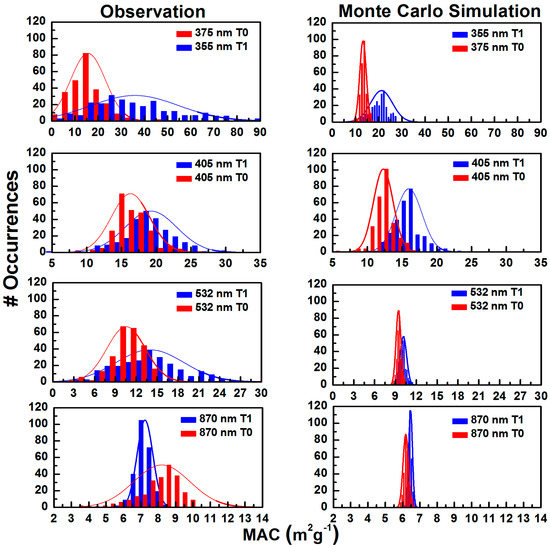 Histograms of observed (left panel) and modeled (Monte Carlo, right panel) BC mass normalized absorption cross-section (MAC) overlaid with the normal distributions for 22–28 June 2010 at T0 and T1. The Monte Carlo simulation considers only the measurement uncertainties of PA and SP2. The modeled analysis represents the MAC distribution of each wavelength obtained from the regression.