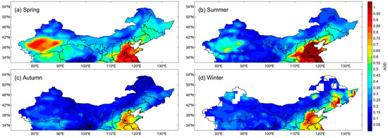 Figure 4 shows the spatial distribution of 16-year averaged AOD for spring, summer, autumn, and winter over North China. The spatial distribution of seasonally averaged AOD was similar to the spatial pattern of the multi-year averaged AOD. In all four seasons, the highest AOD loadings were usually located in the North China Plain and East China. The seasonally averaged AOD over North China varied from spring to winter, with the maximum in spring (0.430 ± 0.049), followed by summer (0.356 ± 0.035), and then winter (0.282 ± 0.039) and autumn (0.219 ± 0.022) (see Figure 3). This seasonal pattern indicates that spring may be the most polluted season over North China, possibly due to the peak dust aerosol loading transported from the deserts in Northwest China, high levels of biomass burning, and fugitive dusts from natural surfaces in spring. The second-highest AOD levels occurred in summer, which can be explained by stronger photochemical interactions owing to higher air temperatures, higher amounts of water vapor, and droplets suspended in the atmosphere during summer [27,28]. These factors favor the increase in aerosol loading during this season.