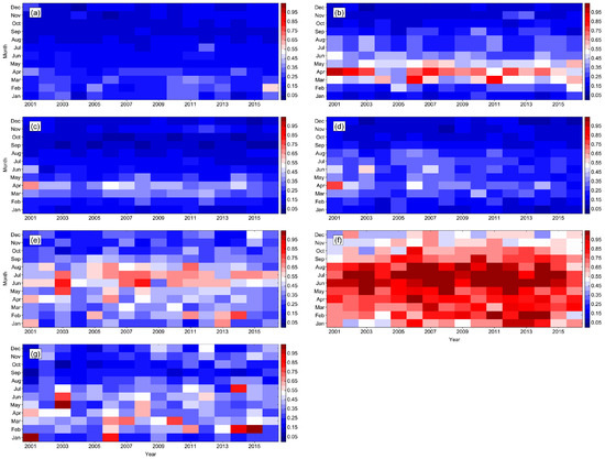 The notably high AOD values that were observed in April 2001 in both Qinghai Tibet and Northwest China were consistent with the maximum that occurred in April 2001 in southern Xinjiang. Hence, it can be inferred that the dust events that occurred in April 2001 in southern Xinjiang influenced the aerosol loadings of both Qinghai Tibet and Northwest China. Between 2001 and 2016, the North China Plain, with its intensive industrial activities and high population density, tended to be characterized by high aerosol loadings, especially during the period of May–August. The high aerosol content can be explained by hygroscopic particle growth and coagulation, with high temperatures and relative humidity in summer [32]. During the whole period, most of the AOD values (nearly 80%) were greater than 0.6 in East China, with its intensive industrial activities and high population density, reflecting the contribution of particulate matter pollution, especially fine particulate matter with aerodynamic diameters less than 2.5 μm [33,34]. These results agree with those of Guo et al. (2011) [15]. There were three main peaks in AOD in Northeast China: January 2001, February 2014 and 2015, and May and June 2013. The high aerosol loadings in winter were associated with coal combustion for domestic heating [35,36], while in summer they were related to the hygroscopic growth of aerosols in the humid atmosphere [37,38].