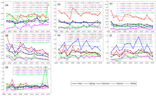 Annual and seasonal AOD time series averaged for the period 2001–2016 for (a) northern Xinjiang, (b) southern Xinjiang, (c) Qinghai Tibet, (d) Northwest China, (e) North China Plain, (f) East China, and (g) Northeast China, together with the slopes, correlation coefficient (r), two-sided p-value (p), and standard error (SE) of the linear trends.