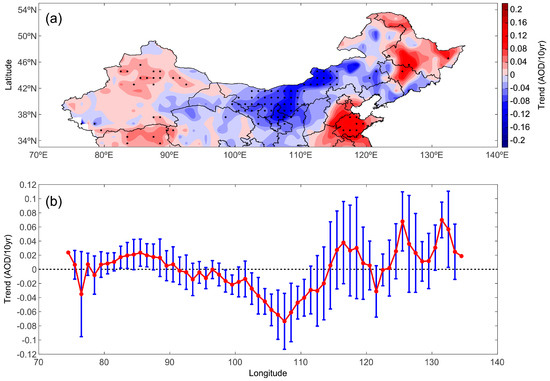 Annual spatial distributions of linear trends from MODIS AOD over North China from 2001 to 2016 (a), and the corresponding meridionally averaged trends (b). Dots indicate significance at 95% confidence level.