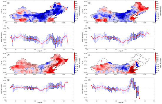 Similar to Figure 7b, the annual meridionally averaged trends are shown in Figure 8c,d,g,h. The net negative trends around 90°–130° E in spring are largely associated with the decreasing dust emissions [39]. The summer meridionally averaged trends were negative in Qinghai Tibet and Northwest China (90°–117° E) due to decreases over the dust source regions [39,41], but were positive in Northeast China (120°–135° E). In general, the autumn meridionally averaged trends were positive, corresponding to the increasing AOD, while the AOD showed decreasing trends in Northwest China (103°–110° E). The notably positive trends around 114°–120° E during winter are indicative of the increasing pollution emissions in East China. Southern Xinjiang (75°–90° E) showed weak increasing trends, while Northwest China (100°–110° E) showed weak decreasing trends, in winter. It should be noted that the the above annual meridionally averaged trends in four seasons still need to be confirmed in the future, because of the non-significant statistics for the whole North China region.