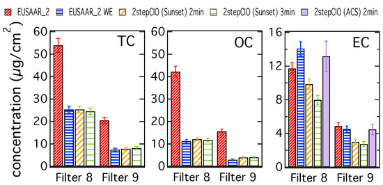 - Chiappini, L.; Verlhac, S.; Aujay, R.; Maenhaut, W.; Putaud, J.P.; Sciare, J.; Jaffrezo, J.L.; Liousse, C.; Galy-Lacaux, C.; Alleman, L.Y.; et al. Clues for a standardised thermal-optical protocol for the assessment of organic and elemental carbon within ambient air particulate matter. Atmos. Meas. Tech. 2014, 7, 1649–1661. [Google Scholar] [CrossRef]