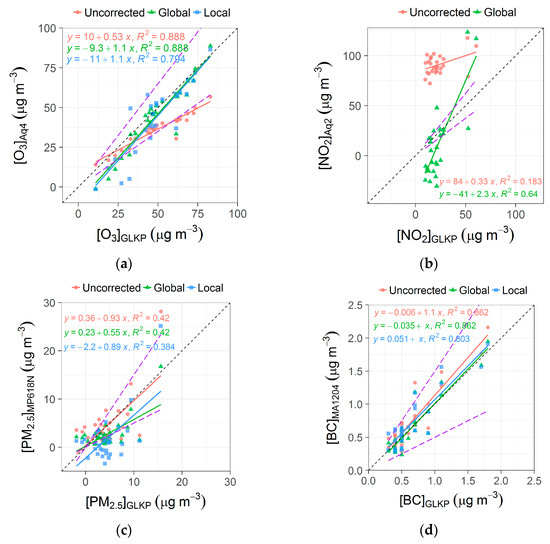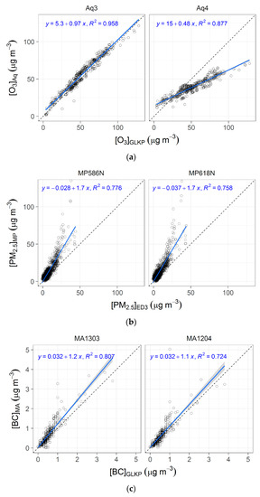 | Calibration Period | n | Slope | Intercept/μg m−3 | R2 | Slope | Intercept/μg m−3 | R2 |