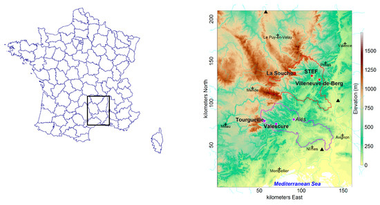 - According to the proximity of the Cévennes mountains: data from La Souche and Tourgueille, which are located near mountain passes have been put together and labelled as “mountain”; data from Villeneuve and Alès, which are located in hilly areas in the plains have been put together and labelled as “hills”. Finally, the two remaining stations—STEF and Valescure—located, respectively, in the Ardèche valley and near the St Jean’s Gardon valley, have been labelled as “transition”.