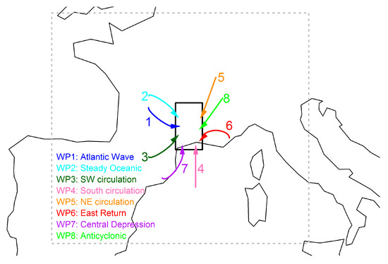 Atmospheric flows in the low atmospheric layers corresponding to weather patterns (WP) analysed on the grey dash rectangle according to the classification proposed by [46]. The arrows indicate atmospheric flows for the studied area represented by a black rectangle. Adapted from [46,47].