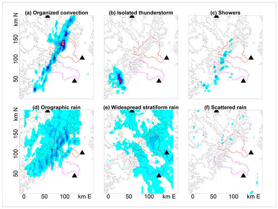 Illustration of the six rainfall time steps at different types: each picture represents 5-min rainfall accumulation (mm/5’). The time steps chosen (in UTC) are: (a) 20/07/2014 8:05–8:10, (b) 21/05/2014 12:50–12:55, (c) 09/10/2014 01:00–01:05, (d) 04/11/2014 00:40–00:45, (e) 07/07/2014 10:10–10:15, and (f) 07/07/2014 14:40–14:45. The triangles indicate the location of the radars.
