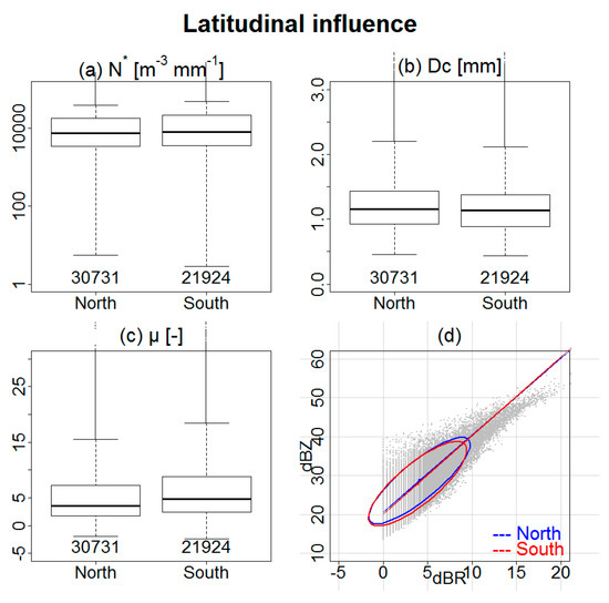 Figure 4 shows, in the form of box-and-whisker plots, the distributions of the three DSD parameters for the stations of the Northern and Southern transects; the Z-R scatterplot, computed from the 5-min DSD data is displayed as well, together with the 80% confidence ellipses and the corresponding least-rectangles linear regression. Figure 4 shows that latitude had a small influence on DSD properties. Only the shape parameter was slightly higher in the south. This proves that the climate of this region is homogeneous, with respect to the distance to the sea. The median values of N*, Dc, and μ were, respectively, about 9000 drops m−3 mm−1, 1.1 mm, and 3. The dispersion was relatively large, with interquartile [Q1; Q3] values in the order of 10,000 drops m−3 mm−1 for concentration, 0.5 mm for characteristic diameter, and 5 for the shape parameter. The scatterplot between dBZ and dBR also exhibited a large dispersion. In such a case, as shown in [30], different fitting techniques may give significantly different Z-R relationships. The least-rectangle linear regression used herein is clearly not well suited for high rain-rate values. However, it was chosen because there was no reason to consider the rainfall rate or the reflectivity factor as the explanatory variable. Here, the aim was to obtain a qualitative assessment of the influence of the various factors considered, on the DSD parameters and the Z-R relationships coefficients.