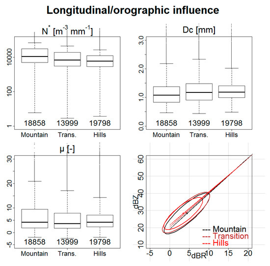 Figure 5 represents the same kind of comparison for the longitude, which is associated, in this region, with different topographic environments. The orographic environment had a more visible influence on DSD parameters. By going from the mountain to the hills, all the N* quartiles decreased. Only the minimum value of N* was lower in the transition zone, making the dispersion of N* in this zone slightly greater. The two first quartiles of Dc increased, going from the mountain to the hills. The upper extremity of the Dc box-and-whisker plot had fairly similar values in the mountain and hills regions, but was higher in the transition zone where the dispersion was thus also greater. For the shape parameter, the quartiles 50%, 75%, and the upper extremity of the box-and-whisker plot decreased, going from the mountain to the hills. The increase of this parameter in the mountains may be explained by coalescence and break-up acting simultaneously [49].