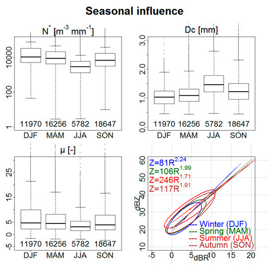 Figure 6 represents, in the same manner, the influence of the seasons. Summer (JJA) was significantly different from the other seasons, with lower drop concentrations, higher characteristic diameters (the quartile Q1 of summer is equivalent to the quartile Q3 in winter), and with lower values and variability for µ. The Z-R relationship in summer differed from the other seasons, with a stronger pre-factor (corresponding to the intercept of the Z-R relationship in a log-log plot) and a lower exponent (with respect to the slope): for the same rain-rate (especially for weak to moderate rain-rates), the reflectivity factor was higher because of the larger diameters. This summer particularity can be explained by the greater number of convective rain events and this encourages the use of a Z-R relation adapted to this type of rain during summer.