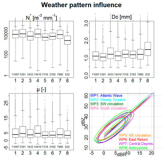 Figure 7 represents the influence of weather patterns (WP) on DSD characteristics and the Z-R relationship using the whole DSD dataset. Two groups can be identified: