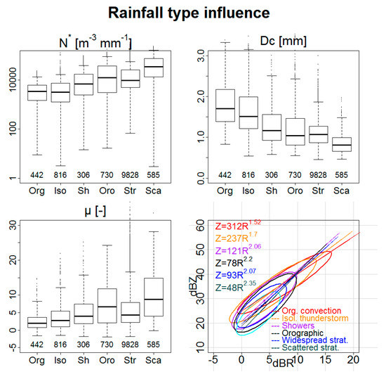 Figure 8 shows the influence of rainfall types in the same way as in the previous figures. It clearly highlights that the most discriminating factor is the rainfall type. It is observed that the values of the DSD parameters are very dependent on the degree of convection of the precipitating systems. The quartiles of the characteristic diameter (with respect to the shape and concentration parameters) decrease (with respect to the increase), moving from organized convective systems and isolated thunderstorms, to showers and stratiform rains. The dispersion of characteristic diameters is more important for rainfalls of convective types (Org, Iso, and Sh), while that of the shape parameter is more important for scattered rains and orographic rains. The orographic precipitations present the same properties as showers for characteristic diameter and the Z-R relationship and are close to those of scattered rainfalls for concentration and shape parameters.