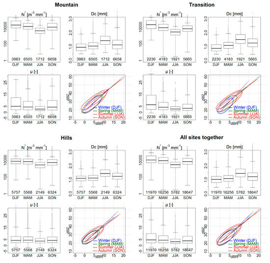 In autumn, all parameters have intermediate characteristics between summer and winter. The 80% confidence ellipse of the Z-R plot during autumn was similar to those of winter and spring, for low and medium rainfall rates values, while it merged with that of summer for high rainfall rates. Spring was intermediate for μ and N*, but not for Dc, whose characteristics were closer to those of winter.