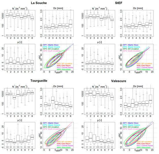 However, strong variability appeared when the stations of the transition and mountain areas were separately analysed. Figure 10 is a composition of Figure 7 for the DSD stations located in these areas. It shows that the distributions of N* and Dc, according to weather patterns, were consistent between the two stations of the north. Those of Valescure were slightly more contrasting, especially during WP3, for which the Dc values are bigger and those of N* are more scattered. The distributions of N* and Dc for Tourgueille were totally different, again, especially for WP3, with very large drops and small concentrations. WP3 characteristics (discussed in Section 4.3) are, thus, exacerbated in the mountainous context. Concerning the distributions of the shape parameter, they were considerably different at each location depending on the weather patterns. The shape parameter appears to be very sensitive to local configuration; it seems that the high values and high variability of µ are related to the exposure of the site to the wind. Indeed, the site of Tourgueille, which is oriented southeastward, has a higher µ for Mediterranean fluxes (WP4 and 7), while the site of Valescure, which is oriented westward, has higher µ quartiles for oceanic fluxes (WP1, 2, and 3).