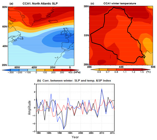First pair derived through CCA between winter SLP of North Atlantic sector and Iraq winter temperature fields, extending over the 1979–2016 period. (a) SLP map, explaining 32.22% of the total variance; (b) SLP (blue line), Iraq temperature (black line) time series associated to patterns in panels (a,c), the correlation between these two time series is 0.76; (c) temperature map, explaining 54.73% of the total variance. The NAO index (red line in panel (b)) is correlated with the SLP time series at the 0.35 level. The black contour line in panel (c) marks the Iraq border.