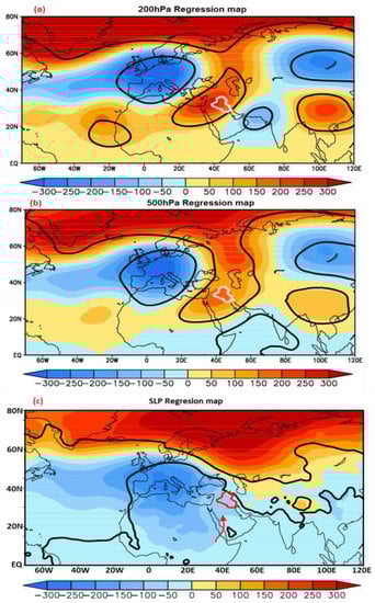 The physical mechanisms connecting the Indian Ocean sector with Iraq summer temperatures was investigated through regression maps of the GPH 200 hPa, GPH 500 hPa and SLP fields on the time series of SLP, derived through CCA (Figure 8b). The GPH 200 hPa and GPH 500 hPa regression maps include a barotropic Rossby wave-like structure, with a higher wave number that that derived for the winter season (Figure 9a,b). At the surface (Figure 9c), a significant gradient pressure gradient is located over Iraq and extends toward the Indian Ocean, consistent with the CCA (Figure 8a). The associated circulation brings the hot air from the India and Africa through Arabian Desert to Iraq, consistent with the positive temperature anomalies derived through CCA (Figure 8c). In synthesis, the Iraq summer temperature is connected to the warm air advection from the India and Africa through Arabia Peninsula.
