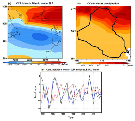 First pair derived through CCA between winter North Atlantic SLP and winter Iraq precipitation fields, extending over the 1979–2009 period. (a) SLP map, explaining 36.96% of the total variance; (b) SLP (blue line), Iraq precipitation (black line) time series associated to patterns in panels (a,c), the correlation between these two time series is 0.80; (c) precipitation map, explaining 17.71% of the total variance. The NAO index (red line in panel (b)) is correlated with the SLP time series at the −0.80 level. The black contour line in panel (c) marks the Iraq border.