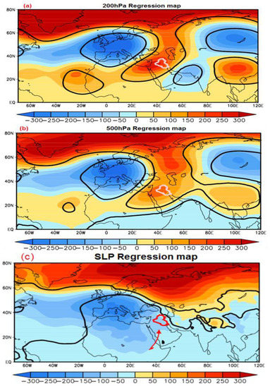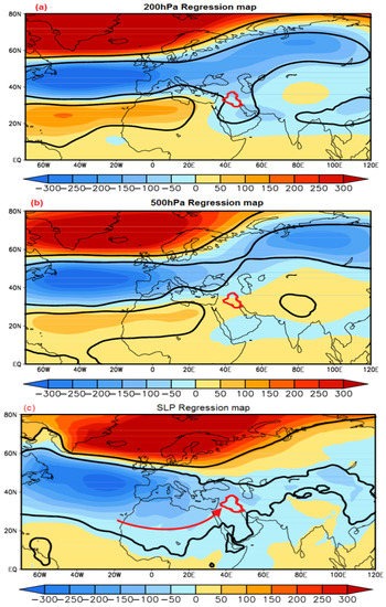 Regression maps of winter (a) geopotential height 200 hPa, (b) 500 hPa and (c) SLP fields on the time series of North Atlantic SLP associated to the first pair derived through CCA (Figure 2b), for the 1979–2016 period. The red contour lines in panels (a–c) mark the border of Iraq. The thick red arrow in panel (c) is used to explain the air advection. The black contour lines in panels (a–c) represent the 95% confidence level of the statistical significance of the regression.