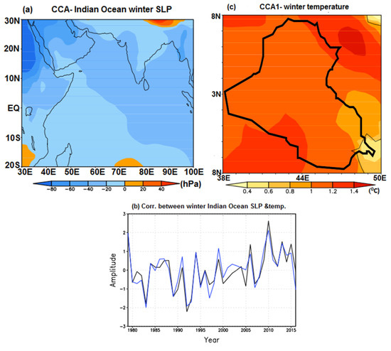 Potential connections between the Indian Ocean SLP and Iraq winter temperature are investigated through CCA between these two fields, extending over the 1979–2016 period. The SLP map of the first CCA pair, explaining 13.13% of the total variance, is largely dominated by negative anomalies over the Indian Ocean (Figure 6a). The corresponding Iraq temperature map, explaining 62.17% of the total variance, has a positive monopolar structure over Iraq (Figure 6c). The associated time components, which show an increasing trend, are correlated at the 0.91 level (Figure 6b).
