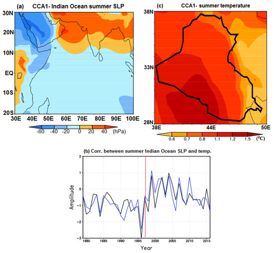A CCA was performed also for the summer seasons, in order to identify potential links between Iraq temperature and the Indian Ocean SLP during this season, for the 1979–2016 period. The SLP map of the first CCA pair, explaining 7.73% of the total variance, includes a maximum over India and minimum over the Arab Peninsula (Figure 8a). The corresponding summer temperature has a positive monopolar structure over Iraq area (Figure 8c) and explains 66.31% of the total variance. The associated time components are marked by a prominent shift to positive values, located around 1998. The correlation between the two time series is 0.88 (Figure 8b). A similar CCA between North Atlantic SLP and Iraq summer temperature and precipitation indicates non-significant connection between these two sectors for this season, also, non-considerable links between Iraq winter/summer precipitation and Indian Ocean SLP are investigated (not shown).