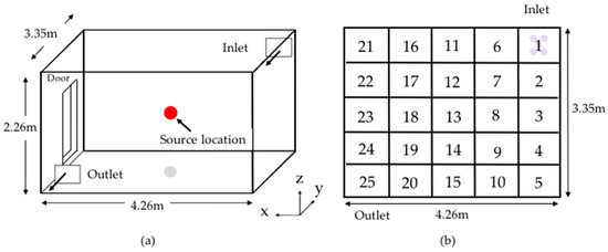 Experiments were conducted in the environmentally controlled, negatively pressurized, aerobiology chamber at the University of Leeds according to methodology set out by King et al. [25]. Dimensions are similar to a UK hospital single patient or isolation room: 4.26 m (L) × 3.36 m (W) × 2.26 m (H). All walls are well insulated and considered adiabatic. External air was HEPA (high efficiency particulate air) filtered before being conditioned by a humidifier and heater. Ventilation inlet and outlet can be seen in Figure 1a. Air was supplied through a high-level wall mounted grille (0.38 m × 0.25 m). Extraction of air was at a low-level diagonally opposite, through a grille of the same design (Outlet).