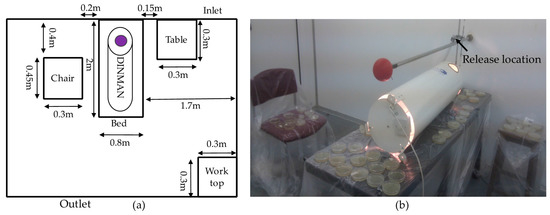 (a) Experimental layout in the chamber for hospital room; (b) Photo of furniture, DIN-manset-up and release location.