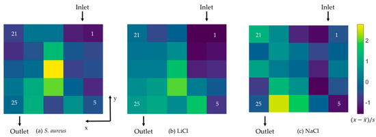 Floor spatial deposition maps of (a) normalized S. aureus; (b) normalized LiCl; (c) normalized NaCl.