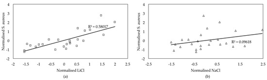 Linear regression of (a) LiCl on S. aureus and (b) NaCl on S. aureus.