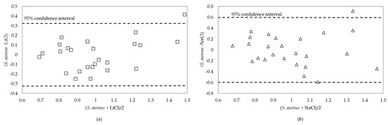 Bland-Altman agreement plots (a) S. aureus vs. LiCl, (b) S. aureus vs NaCl.