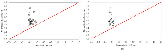 Plots of normalized standard deviation (sd.) for (a) S. aureus vs. LiCl (b) S. aureus vs. NaCl. Solid red line indicates 1-to-1 relationship.