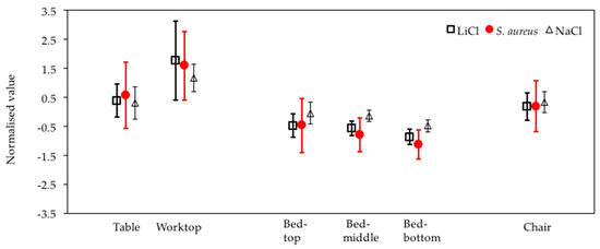 Figure 7 shows the comparison between normalized biological and salt deposition values of the six surfaces in the hospital single patient room replica (similar to [25]): bedside table, chair, worktop and bed split into three parts. The Kruskal-Wallis non-parametric test showed that the intra-group deposition differences were statistically significant (p = 0.0046). Both LiCl and NaCl values were within one normalized standard deviation of S. aureus values as seen by the error bars in Figure 7. Biological deposition showed, however, higher overall normalized standard deviation than both LiCl and NaCl (0.86 vs. 0.53 and 0.36 respectively). Both Li and Na surrogate aerosols gave a good approximation to the S. aureus spread, where the best comparison was found at the near-patient surfaces (table, bed and chair).