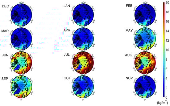 Summer months witness a nearly-complete presence of sunlight, and more open waters, in addition to the majority of liquid precipitation, especially above the vegetated European Arctic, Siberia, and north Canada [35]; all the previous conditions favour more humid atmospheric columns. The most humid TCWV is observed in July, with an average TCWV exceeding 25 kg/m2 for most regions, but lower TCWV values are observed at the higher altitudes (including the Norwegian and Ural Mountains, the Central Siberian uplands, the Chukchi and Verkoyansk ridges, and the Rocky Mountains). The central Arctic Ocean has an even drier TCWV, with averaged JJA around 14 kg m−2; the driest conditions are reported at the Greenland ice sheet with a TCWV less than 5 kg/m2 in interior Greenland.