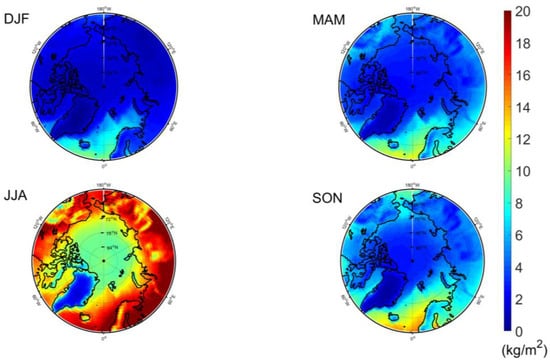 Earlier melt onset in the Barents, Kara, Laptev, and Beaufort seas [39] could contribute to wetter-than-averaged spring TCWV amounts, and thereby a MAM TCWV positive trend in addition to the reported increased freshwater discharge of the Mackenzie River into the Beaufort Sea by about 25% since 2003 [40].