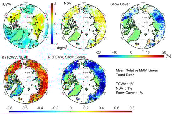 The initial modification of the Arctic vegetation (as one of the impacts of the recent climate changes) takes place at the vegetation boundaries of the Arctic tundra. Increases in vegetation productivity have been observed across the Arctic (e.g., [57]), and recent analyses suggest that the general increases in productivity concern all vegetation types [58]. We try to trace these changes and show when and where the TCWV has its most notable response to them. Additionally, we inspect how the snow cover trends evolve for the same studied period of spring 2001–2015. Figure 4 shows the TCWV, NDVI, and snow cover linear trends at the 95% significant level in spring (2001–2015), as well as the correlations between the TCWV and each of NDVI and snow cover. The enhanced TCWV trend over the Siberian and Mackenzie lands is found to be coincident with enhanced NDVI trends and decreased snow cover, which refers to the earlier snowmelt onset cited previously for both regions (Section 4). Additionally, the inter-annual variability of TCWV in spring shows a significant positive correlation with NDVI, while an opposite correlation with the snow cover fraction appears (Figure 4).