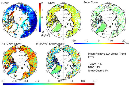 Increased NDVI trends have been previously observed in the Beaufort region coasts and inlands [59], driving the evapotranspiration rates and thereby contributing to the local wet TCWV trends observed in MAM and JJA (Figure 4 and Figure 5).