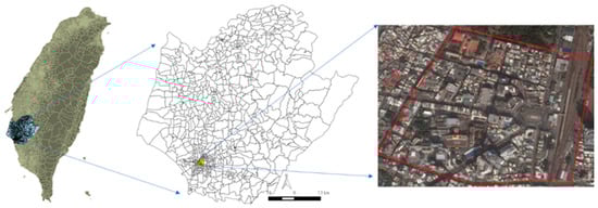 Location of the study area. The blue mark represents the province of Tainan city, the red frame shows the area of interest.