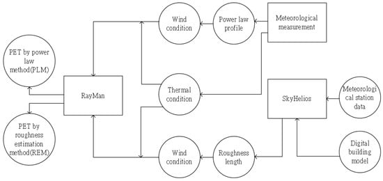 The PLM uses the measured Ta, RH, and Tg to calculate the PET [,,]. However, owing to a lack of WS sensors, this study employed WS information reduced by the power law profile. All the data were then used together with the RayMan model for the calculation of the PET.