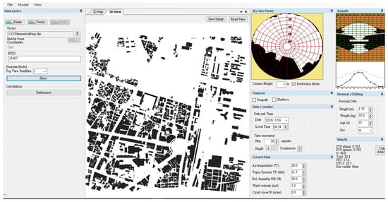 To estimate a microclimate without conducting measurements, this study utilized the SkyHelios model [,], which was developed for estimating the spatial distribution of wind conditions (e.g., WS and WD) and thermal indicators such as physiologically equivalent temperature (PET) by considering building features and meteorological information [,]. The SkyHelios model has been widely used in previous studies in the field of human biometeorology [,,], but the application of the model still requires development and validation.