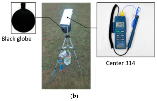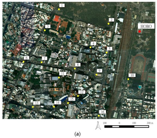 In this study, 16 measurement locations were selected for conductance of thermal environment surveys on 31 July 2015 and 21 January 2016 at 12:00 p.m. The locations were selected based on their different land use types, including commercial areas, residential areas, schools, hospitals, and open spaces (Figure 5a). Each location was equipped with a “Center314” data-logger that recorded Ta, globe temperature (Tg), and RH (Figure 5b). The precisions of the instruments were ±0.5 °C for the air thermometer, ±2% for the RH meter, and ±0.2 °C for the globe temperature meter.