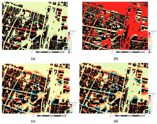 The WS was approximately 0.3–0.4 m/s in open areas on the typical summer day, as opposed to the initial WS input of 2 m/s. This was greater at the corners of buildings, where the WS was up to 0.5 m/s owing to corner flow. However, the WS was decreased to 0.1–0.2 m/s on the leeward side of buildings because of the wake effect (Figure 6c). In winter, the initial input WS had increased to 5 m/s. The WS in the open area was 0.6–0.7 m/s and that at the front of buildings was 1 m/s (Figure 6d).