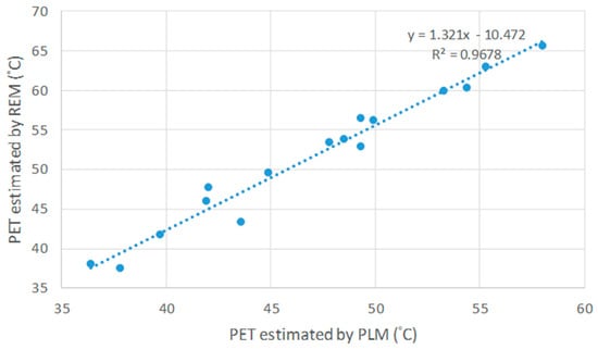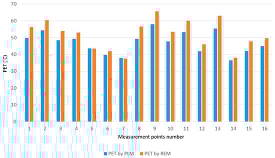 The correlation coefficient between the PET calculated using the PLM and REM is high (Figure 8), reaching 0.967. This indicates that the SkyHelios model accurately estimates the human thermal bioclimate in urban areas without requiring local wind measurements. However, because the WS modeled by SkyHelios was lower than the WS estimated by the power law profile, as shown in Figure 7, the PET calculated using the REM is higher at each location compared with that calculated using the PLM.