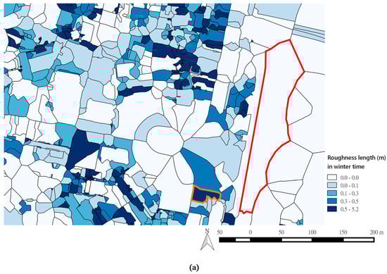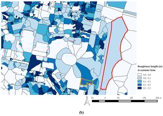 In the summertime, the incident wind is from 270° and causes a high roughness length of approximately 0.03 m in the red frame because of the presence of many buildings crossing the WD. Buildings oriented in the east–west direction, for example, that are located west of the railroad (orange frame in Figure 9b) cause a relatively low roughness length of 0.36 m.