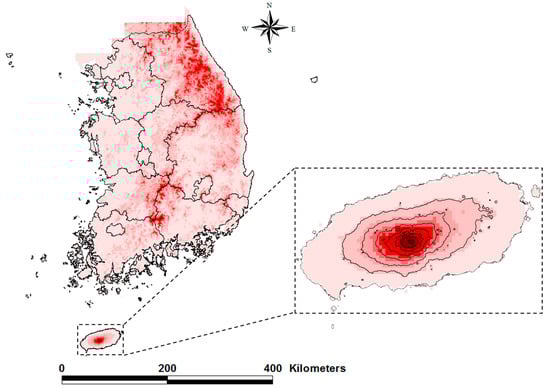The Jeju Island is a volcanic island that is composed of about 360 small-scale volcanoes and volcanic cones [12]. The Hallasan Mountain is located at the center of the Jeju Island, and sits at a height of 1950 m. The Hallasan Mountain has a gentle slope of about 3° along the east-west direction, but a steeper slope of about 5° along the north-south direction (Jeju Special Self-Governing Province, http://www.jeju.go.kr). The shape of the island is elliptical, with a major axis length of 73 km along the east-west direction and a minor axis length of 31 km along the north-south direction. The total area of the Jeju Island is 1848 km2, and the coastal area whose altitude above sea level is less than 200 m covers 55.3% of the island’s total area.