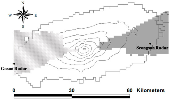 The locations of the Gosan and Seongsan Radars and their radar beam blocking (masking) areas are shown in Figure 2. The radar blocking area in this figure represents the 1.5 km CAPPI (constant altitude plan position indicator) data. Using both of the radars, it is possible to observe the entire island.