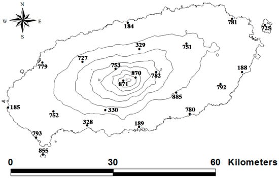 In 1990, KMA started to introduce the AWSs in the Jeju Island [2]. Now, 24 AWSs are being operated [8]. Among them, a total of 16 rain gauges are located in the coastal area whose altitude is less than 250 m, four in between 250~500 m, two in between 750~1000 m, one in between 1250~1500 m, and one at 1500 m or higher. The locations of the rain gauges are presented in Figure 3. As can be seen from this figure, the rain gauges are well-distributed over the Jeju Island. That being said, more than half of the total rain gauges are located in the coastal region (0–250 m), and relatively less in the mountainous area. Also, more rain gauges are located on the northern slope of the Hallasan Mountain than the southern slope, which is due to the steepness of the southern slope.