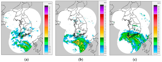 Synthetic radar image around the Korea Peninsula during the Typhoon Nakri in the Jeju Island (2 August 2014). (a) 2014/08/02/00:00; (b) 2014/08/02/06:00; (c) 2014/08/02/12:00.